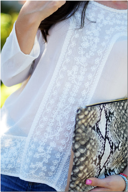 Otra prenda que me parece súper versátil es esta blusa de encaje en color marfil que me compré hace unas semanas en Mango. Es de ese tipo de prendas polivalentes que puedes combinar casi con cualquier cosa, ¿verdad? En esta ocasión, elegí unos jeans, una blazer oversize y mi nuevo clucht con print de serpiente. ¿Qué os parece el resultado?